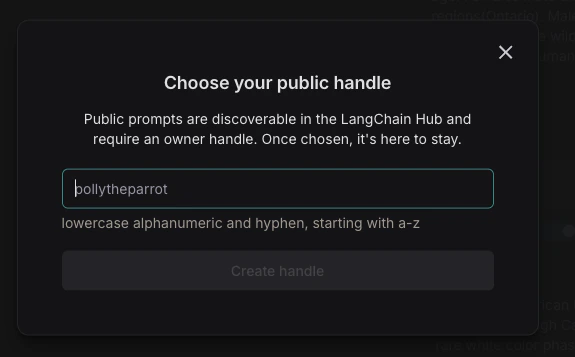 The first time you create a public prompt, you’ll be asked to set a LangChain Hub handle. All your public prompts will be linked to this handle. In a shared workspace, this handle will be set for the whole workspace.