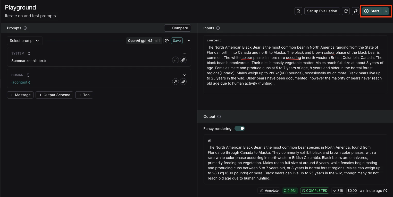 On the left is an editable view of the prompt. The prompt is made up of messages, each of which has a “role” - includingsystem, human, and ai.