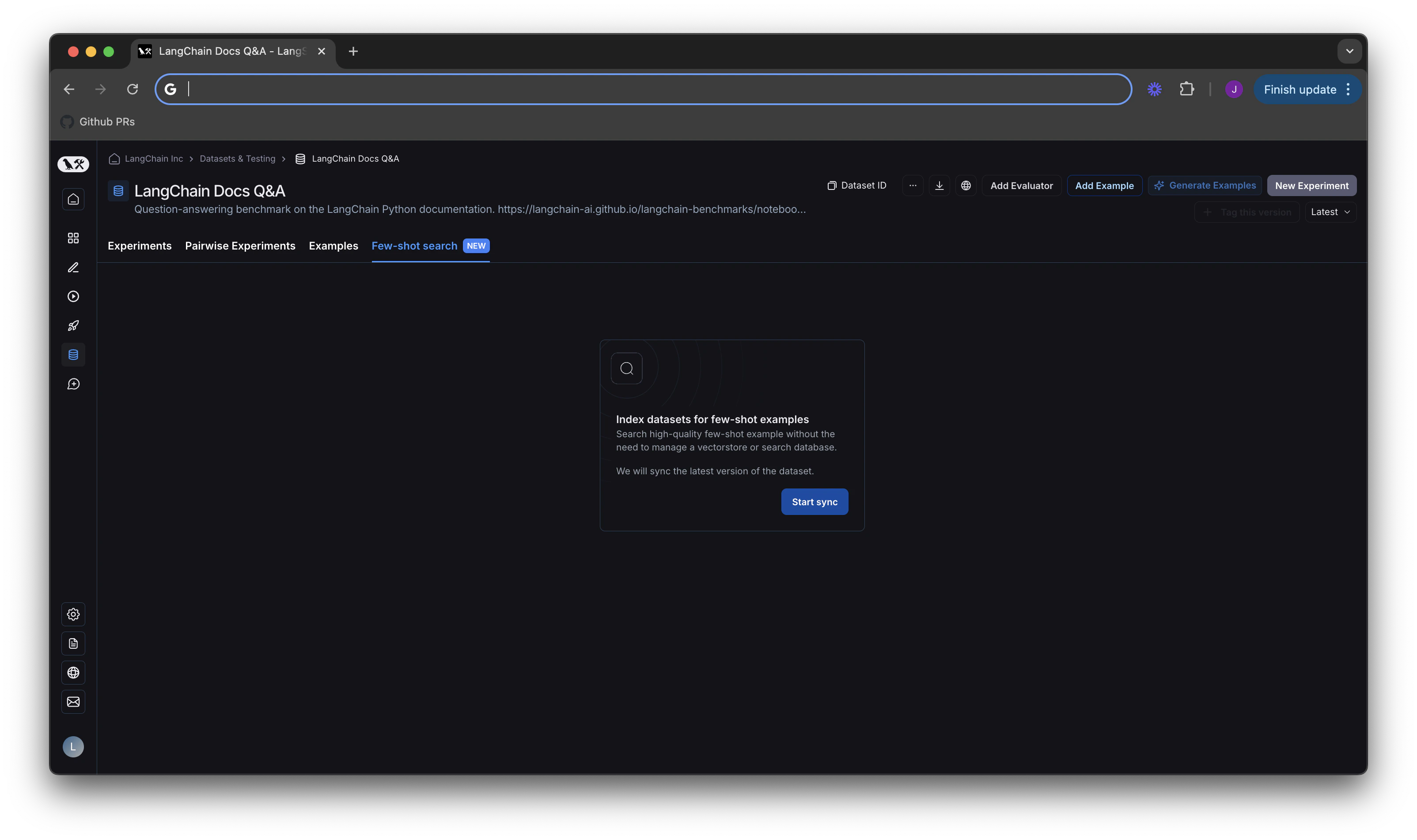 Navigate to the datasets UI, and click the newFew-Shot search tab. Hit the Start sync button, which will create a new index on your dataset to make it searchable.