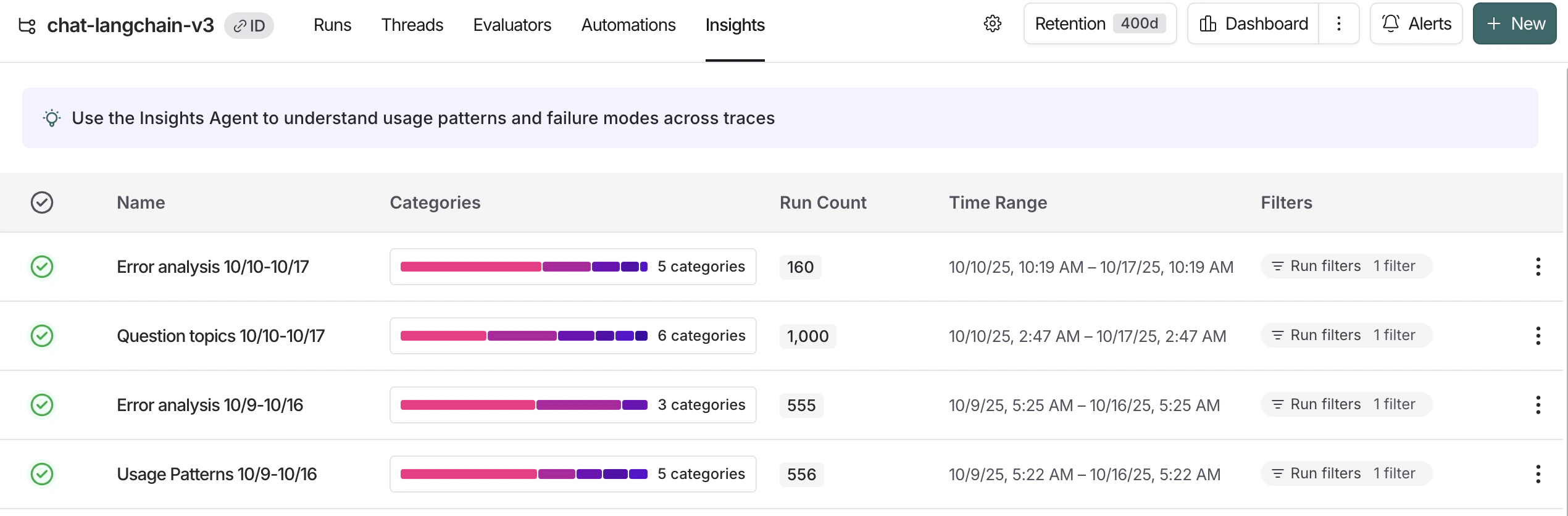 Once your job has completed, you can navigate to the Insights tab where you’ll see a table of Insights Report. Each Report contains insights generated over a specific sample of traces from the tracing project.