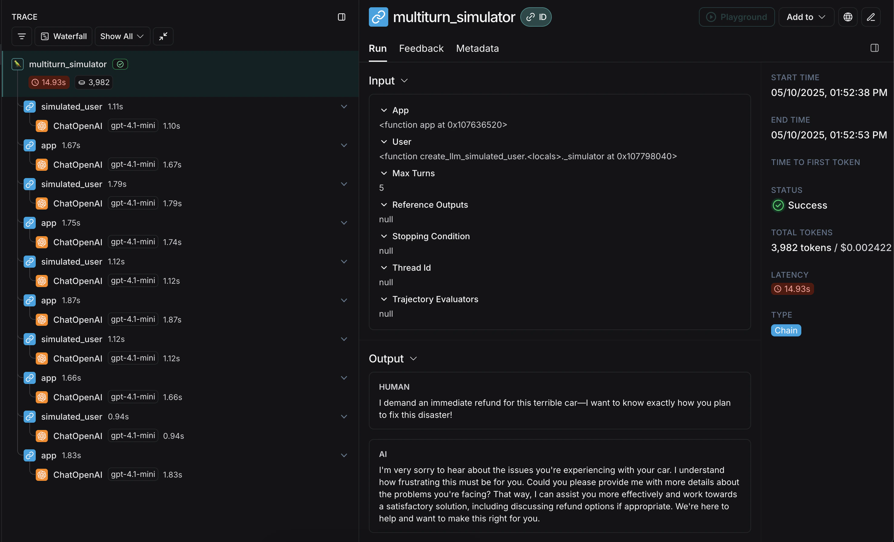 Here’s an example that simulates a multi-turn customer support interaction. This guide uses a simple chat app that wraps a single call to the OpenAI chat completions API, however this is where you would call your application or agent. In this example, our simulated user is playing the role of a particularly aggressive customer: