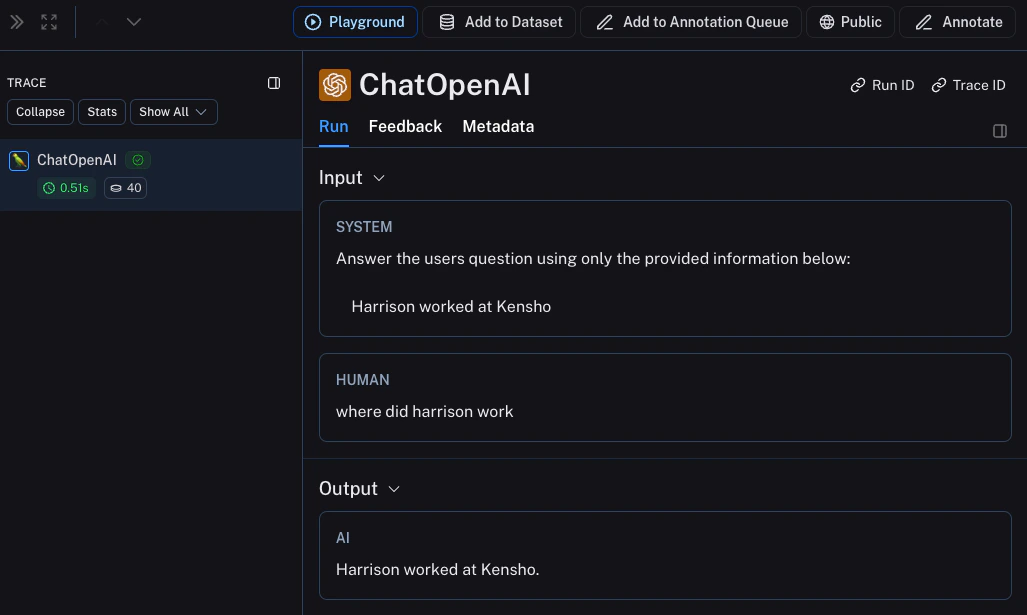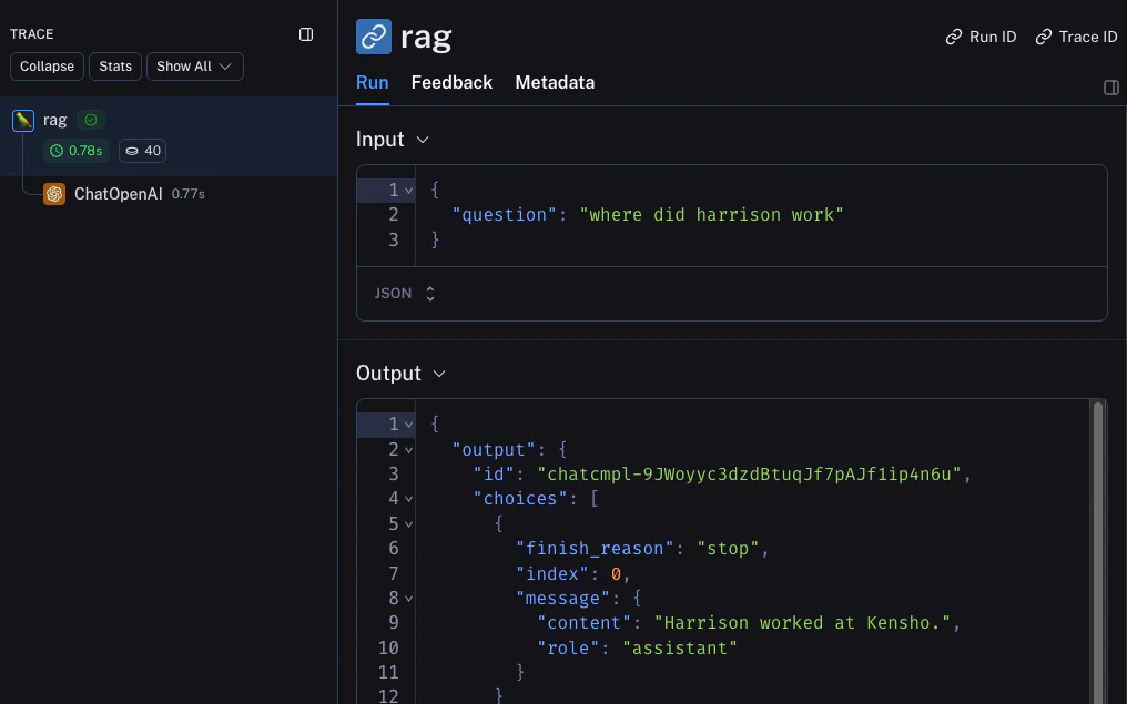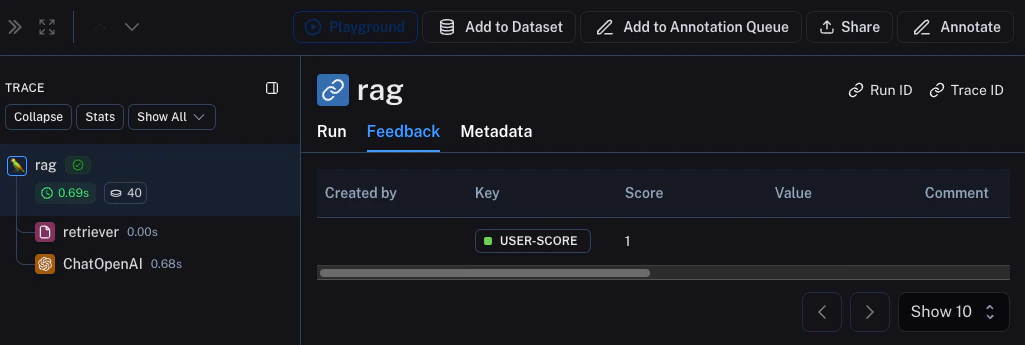 A huge part of having good observability during beta testing is collecting feedback. What feedback you collect is often application specific - but at the very least a simple thumbs up/down is a good start. After logging that feedback, you need to be able to easily associate it with the run that caused that. Luckily LangSmith makes it easy to do that. First, you need to log the feedback from your app. An easy way to do this is to keep track of a run ID for each run, and then use that to log feedback. Keeping track of the run ID would look something like:Metadata tab when inspecting the run. It should look something like this